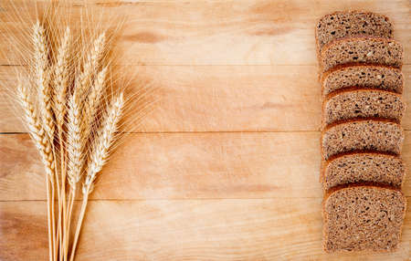 古いヴィンテージの板張りの木製テーブルの素朴なパンと小麦 フリーテキストスペースを持つ古い木製の背景 の写真素材 画像素材 Image